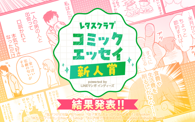 LINEマンガからのお知らせ 2023年05月23日 【結果発表】「レタスクラブコミックエッセイ新人賞 powered by LINEマンガ インディーズ」 レタスクラブコミックエッセイ新人賞powered by LINEマンガ インディーズ★☆★ 結果発表 ★☆★ ご応募ありがとうございました!熱のこもった作品ばかりで、審査は大いに盛り上がりました! オリジナル作品部門 ★ 入賞 賞